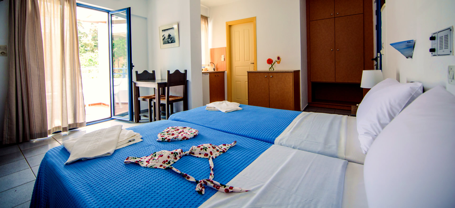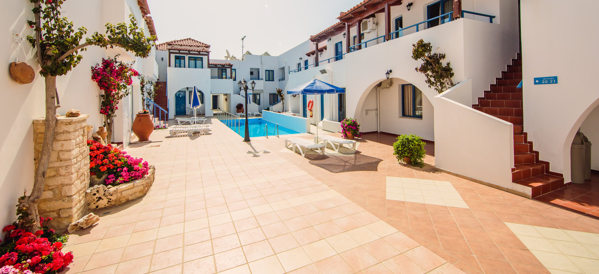Set in a flower-filled two-storey courtyard, with a small swimming pool in the centre, the studios and apartments are scrupulously clean and well-equipped. The management are extremely welcoming and helpful without being intrusive. We have stayed at the Iliana many times,but more recently there have been improvements including better cooking facilities and hair-dryers.”